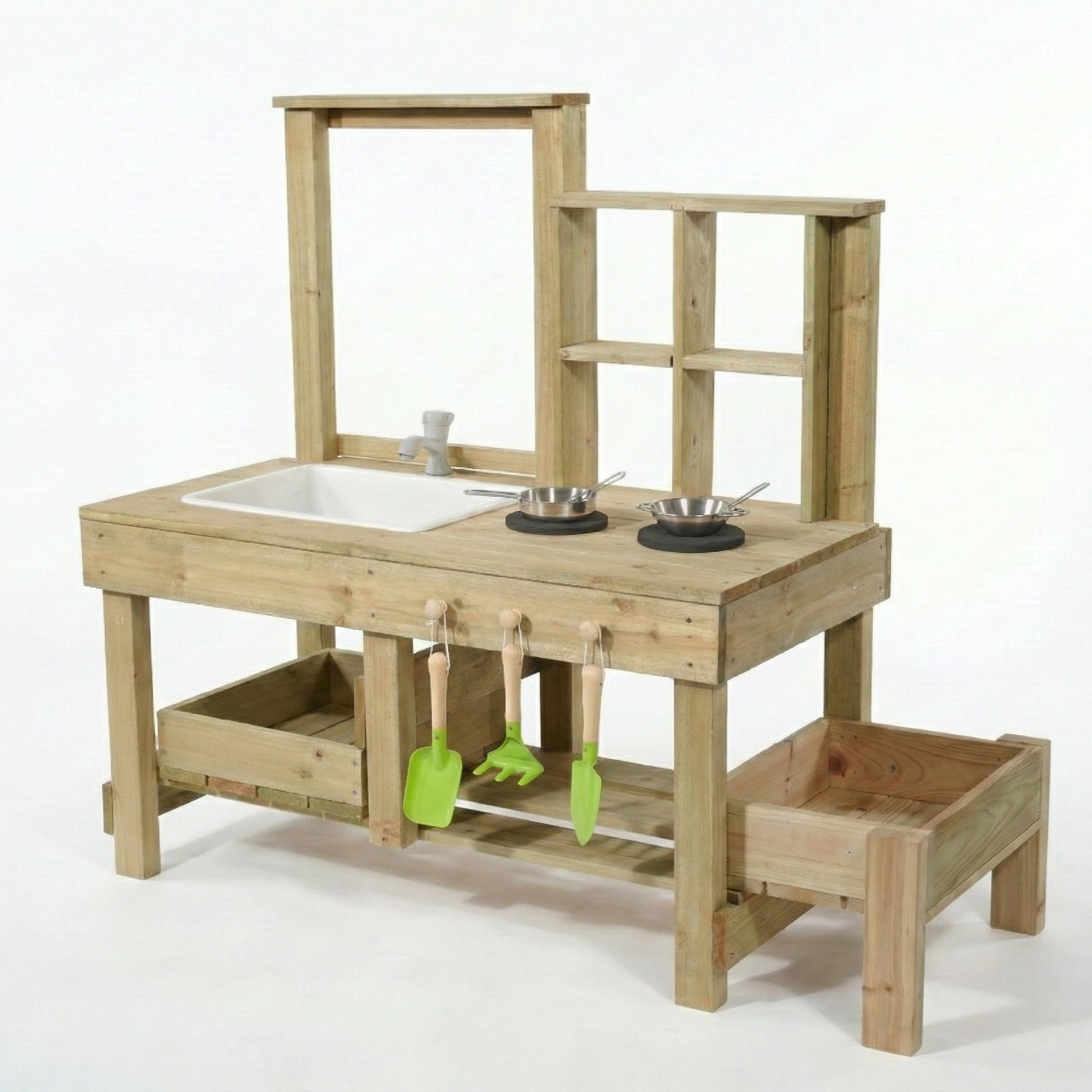 Storage Shelf & Hooks - Multiple storage areas for garden tools (included), play food, and cooking accessories