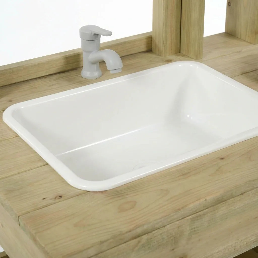 Dual-Function Design - Play kitchen on one side with sink and stovetop, planter table on the other for growing real plants