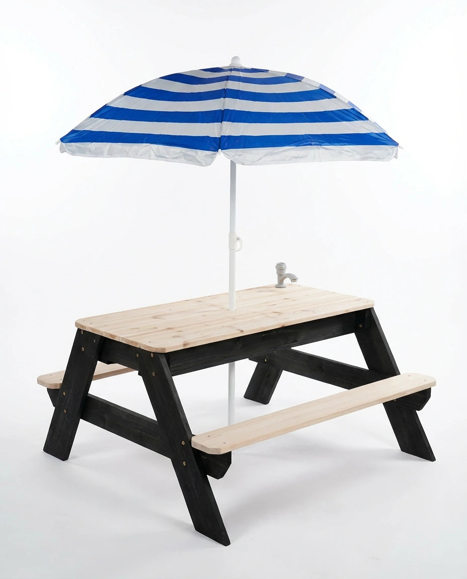 Luckids Picnic Table with Blue Stripe Umbrella - Natural & Black