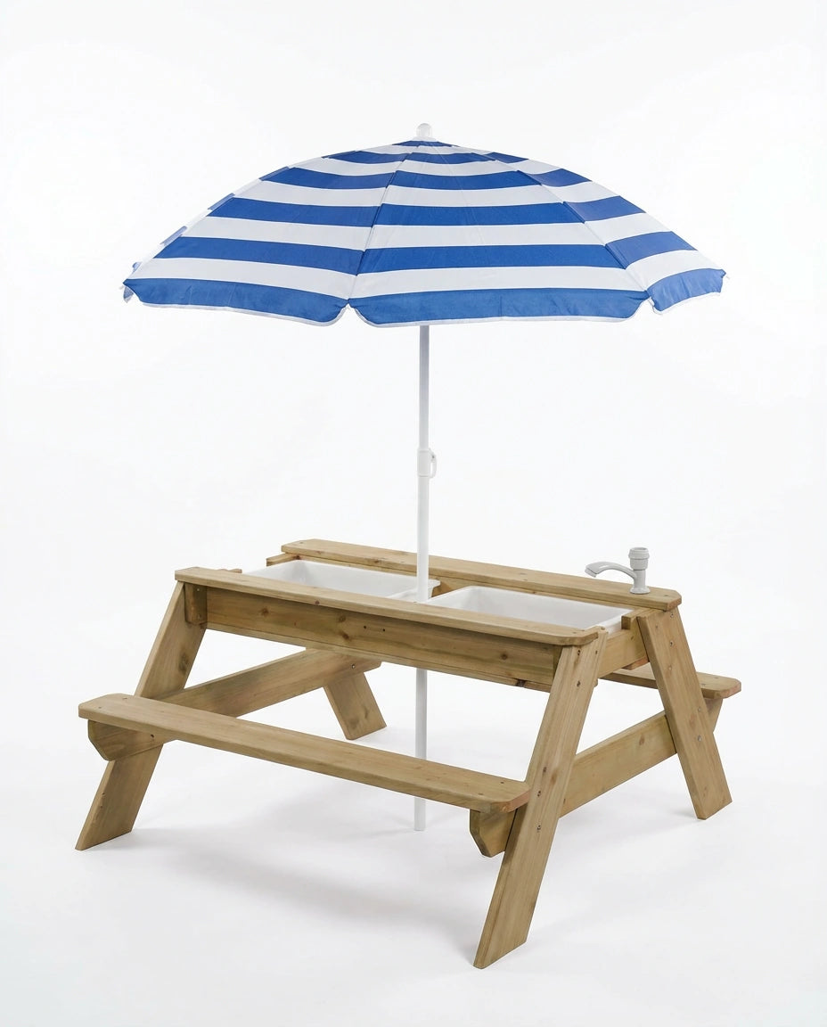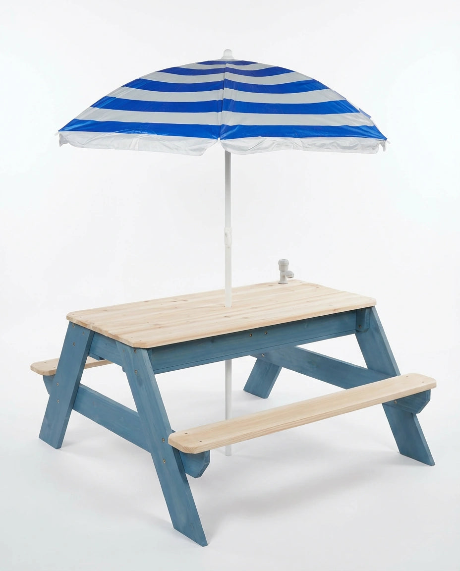 Luckids Picnic Table with Blue Stripe Umbrella - Natural & Blue
