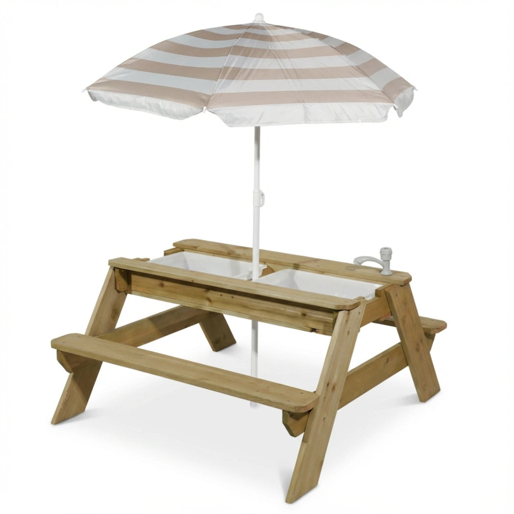 Transform your backyard into an interactive outdoor adventure zone with our premium natural wood water and sand table. Featuring a unique flip-open lid design, working water faucet, and elegant beige-striped umbrella, this dual-compartment play station offers endless sensory exploration in a timeless, natural aesthetic.