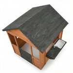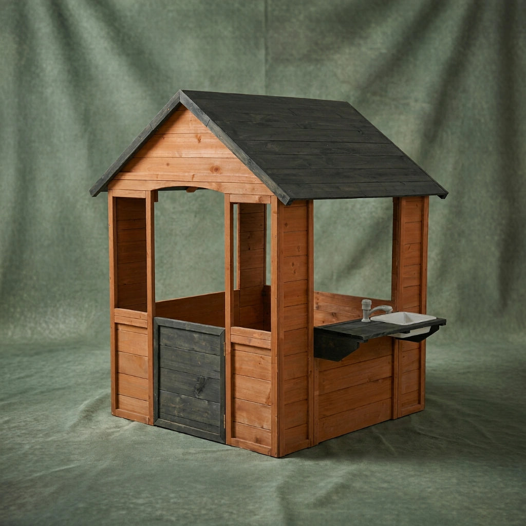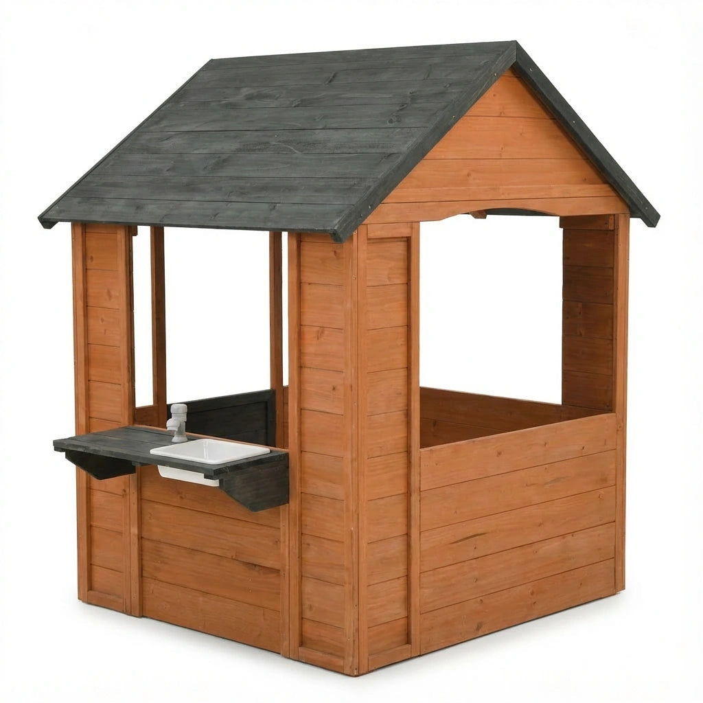 Create magical outdoor adventures with the Luckids Wooden Playhouse with Sink in Brown Wood with Dark Gray Roof. This charming cottage-style playhouse features a classic design with a peaked roof, open windows, door, and an integrated outdoor sink station, providing endless opportunities for imaginative play and outdoor fun.